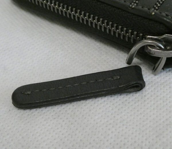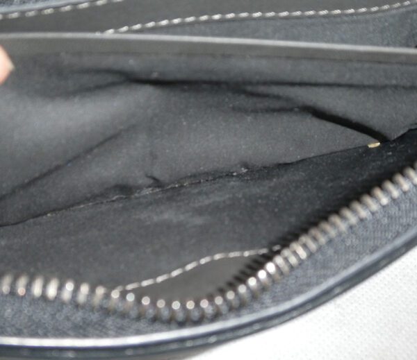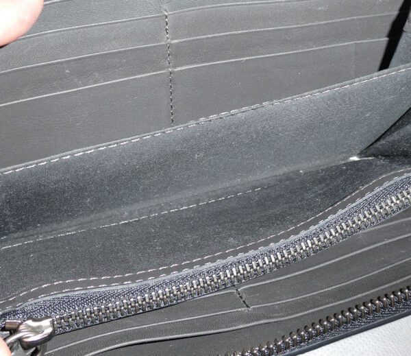 It has very light marks to the leather and lining, a small section of chain detailing on the rear has become loose and a temporary repair has been made, and the leather zipper pull has become detached (connecting pin is missing) but zipper is still fully functioning. I have endeavoured to show these points in the photos