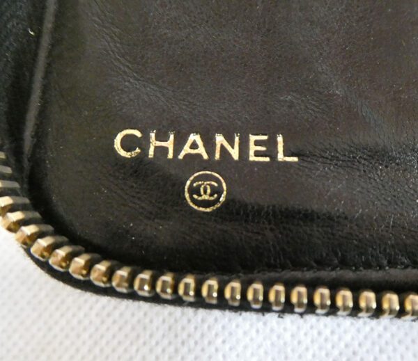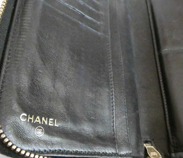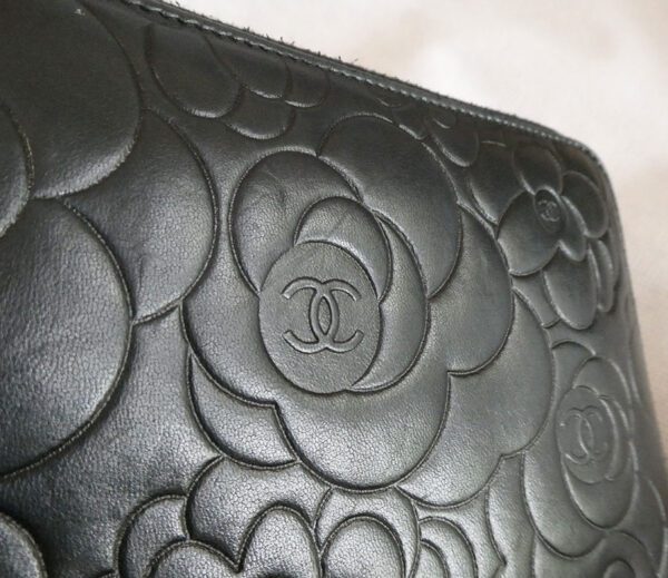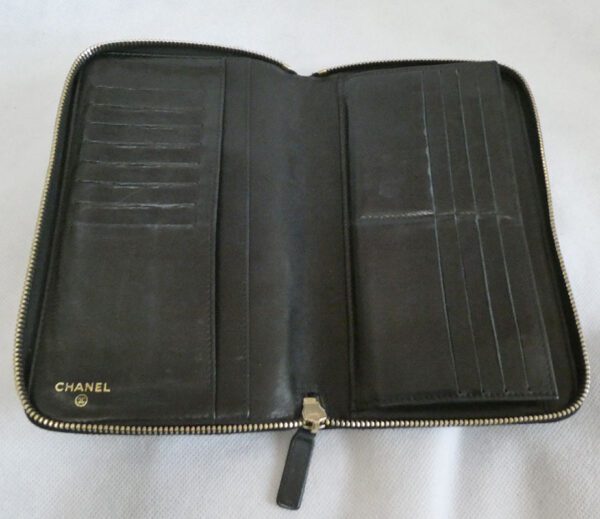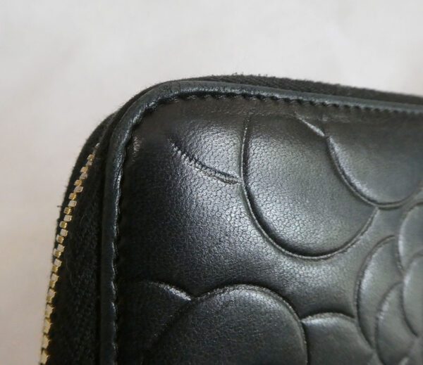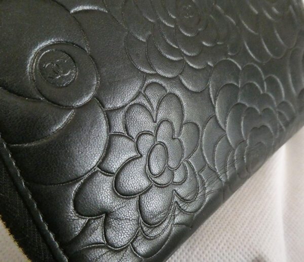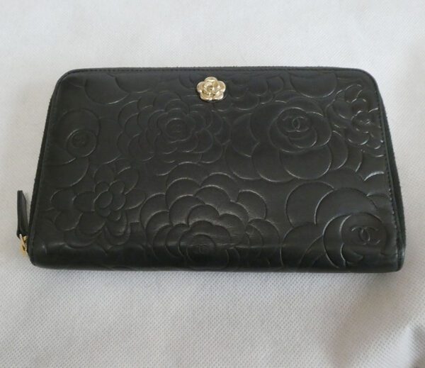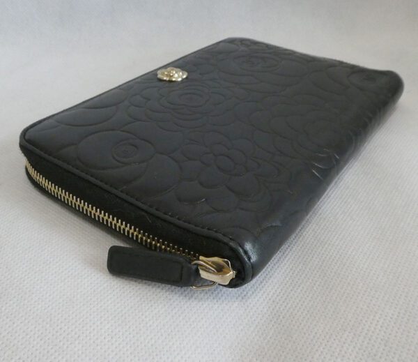 Chanel black lambskin leather camellia embossed large zip wallet purse & box