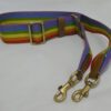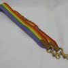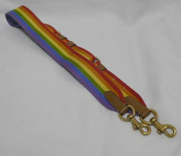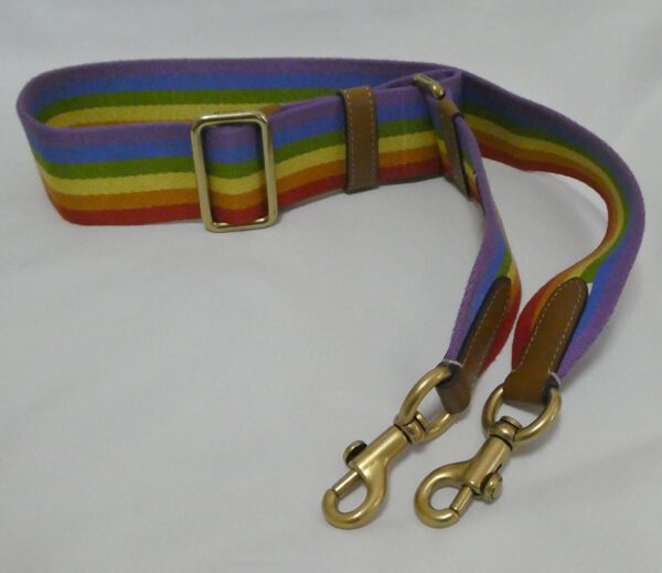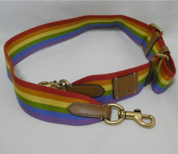 It is made from rainbow coloured webbing with tan smooth leather trim and brass hardware