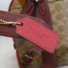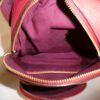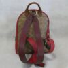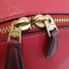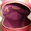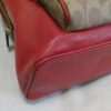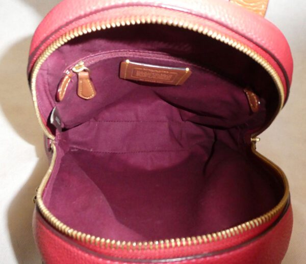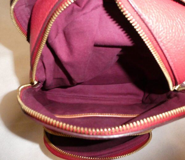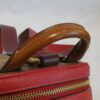 It is made from red pebbled leather with signature coated canvas, burgundy and tan leather trim and brass hardware