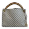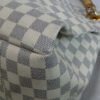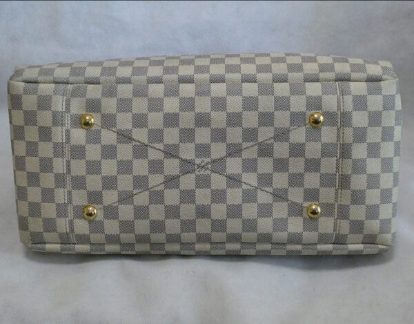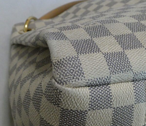 It is made from damier azur coated canvas with leather trim and gold coloured hardware