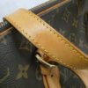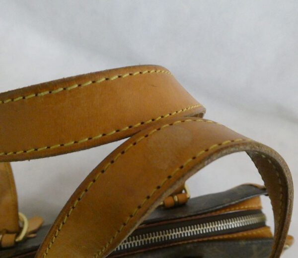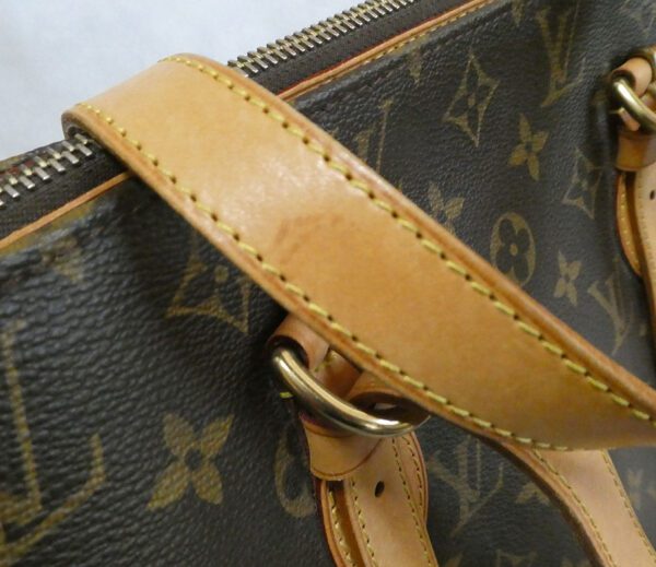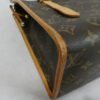 It is made from classic monogram coated canvas with leather trim and brass hardware