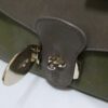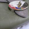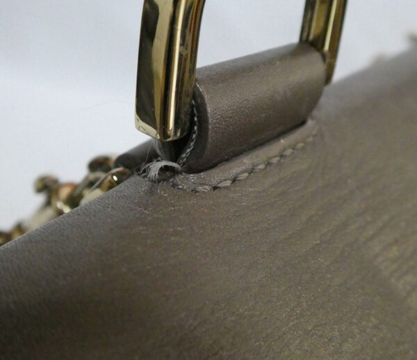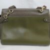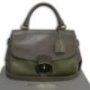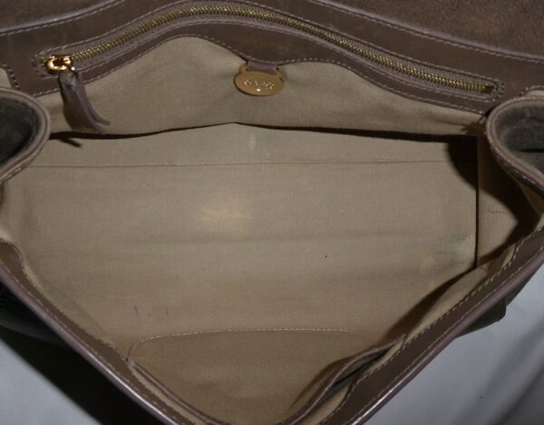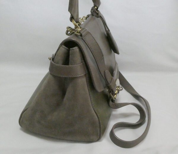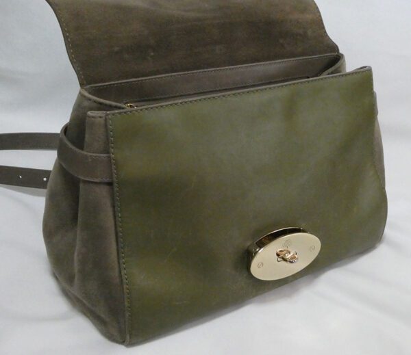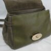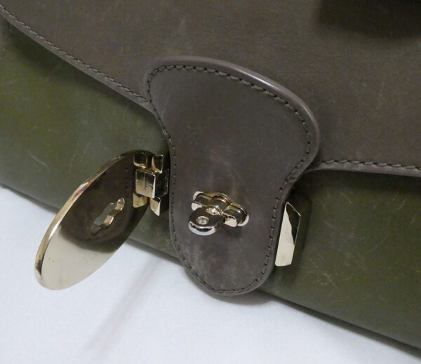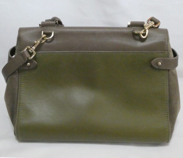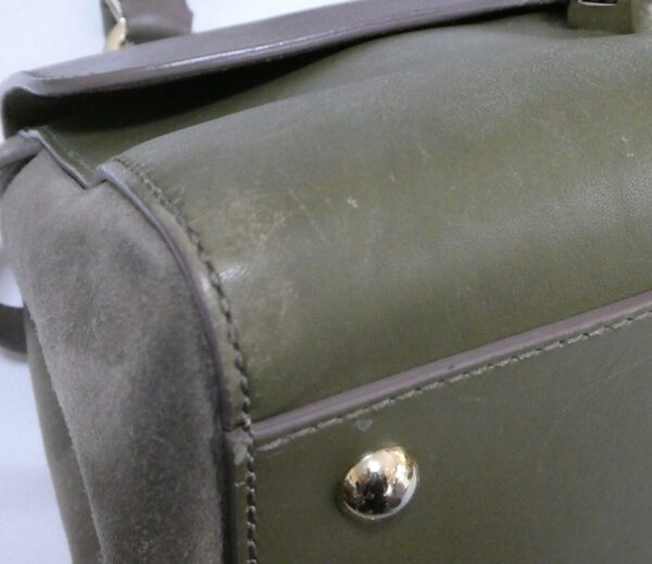 It is made from taupe and pickle green soft tan calfskin leather and taupe suede with gold coloured hardware